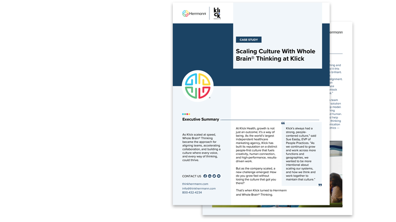 This case study explores how Klick embedded Whole Brain® Thinking across its ecosystem, from onboarding to leadership development. The result is a scalable, intentional culture where cognitive diversity is recognized, collaboration is amplified, and teams are equipped to thrive—no matter how fast the organization grows.